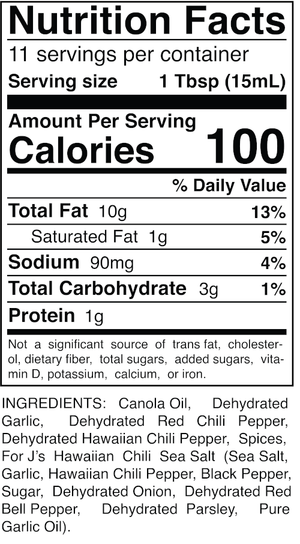 This signature blend of Hawaiian Chili Peppers and our very own “For J’s Hawaiian Chili Pepper Sea Salt” makes this our hottest chili oil yet, perfect for those who enjoy that extra “kick.” This Hot Hawaiian Chili Oil is delicious on everything like eggs, rice, noodles, soups, tofu, pork, beef, fish, vegetables, and so much more.